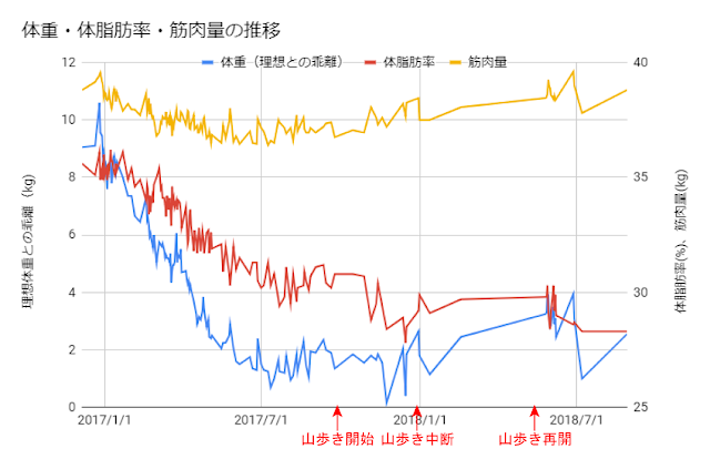 筋肉量は山歩きを始めた2017年10月あたりからじりじり回復傾向に。